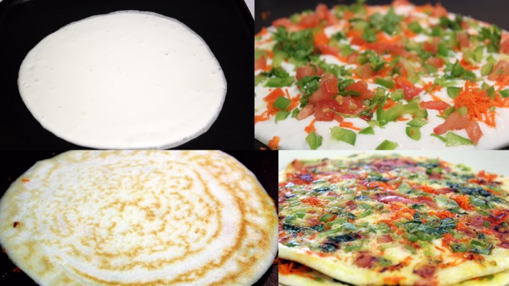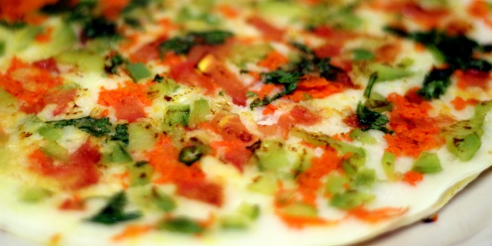 - Top the uthappam with the chopped/grated veggies, sprinkling it around the surface.
